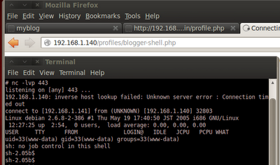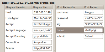 repo and profiles directories. The repo directory contains a file buffd.c. We download this file for later examination. The profiles directory contains the signature files for each user - exactly what we're looking for. We can now inject our PHP reverse shell and gain a remote shell on the server. First, we enable TamperData on Firefox so we can replace the "sig.txt" extension appended to the signature to ".php". We decide to use /pentest/backdoors/web/webshells/php/php-reverse-shell.php as our reverse shell. The IP address is updated and the port number changed to 443. We paste the contents of php-reverse-shell.php into the signature box, enter our SQL injection, and hit Submit.
