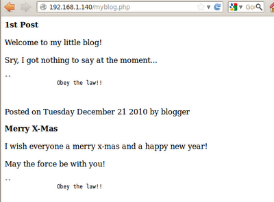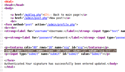By entering basic SQL queries into the password field, we discover that both forms are vulnerable to SQL injection attacks. We are able to change the contents of a signature by entering blogger into the username field, the word "Hacked" into the signature field, and the following into the password field: