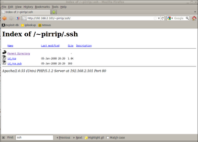 http://192.168.2.101/home/root and found that it was viewable. I did the same for the three known user accounts, but they were all empty. I decided to look for hidden files that might be useful: .bashrc, .bash_profile and .ssh. I got lucky and found that pirrip had a viewable .ssh directory!Not only was it viewable, it contained the private and public SSH keys for